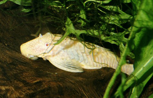 Figure 1: Albino Ancistrus sp. Bu resimdeki albino cüce vatoz, gold formda yani altın renginde,( kırmızı gözlü) albino cüce vatoz.